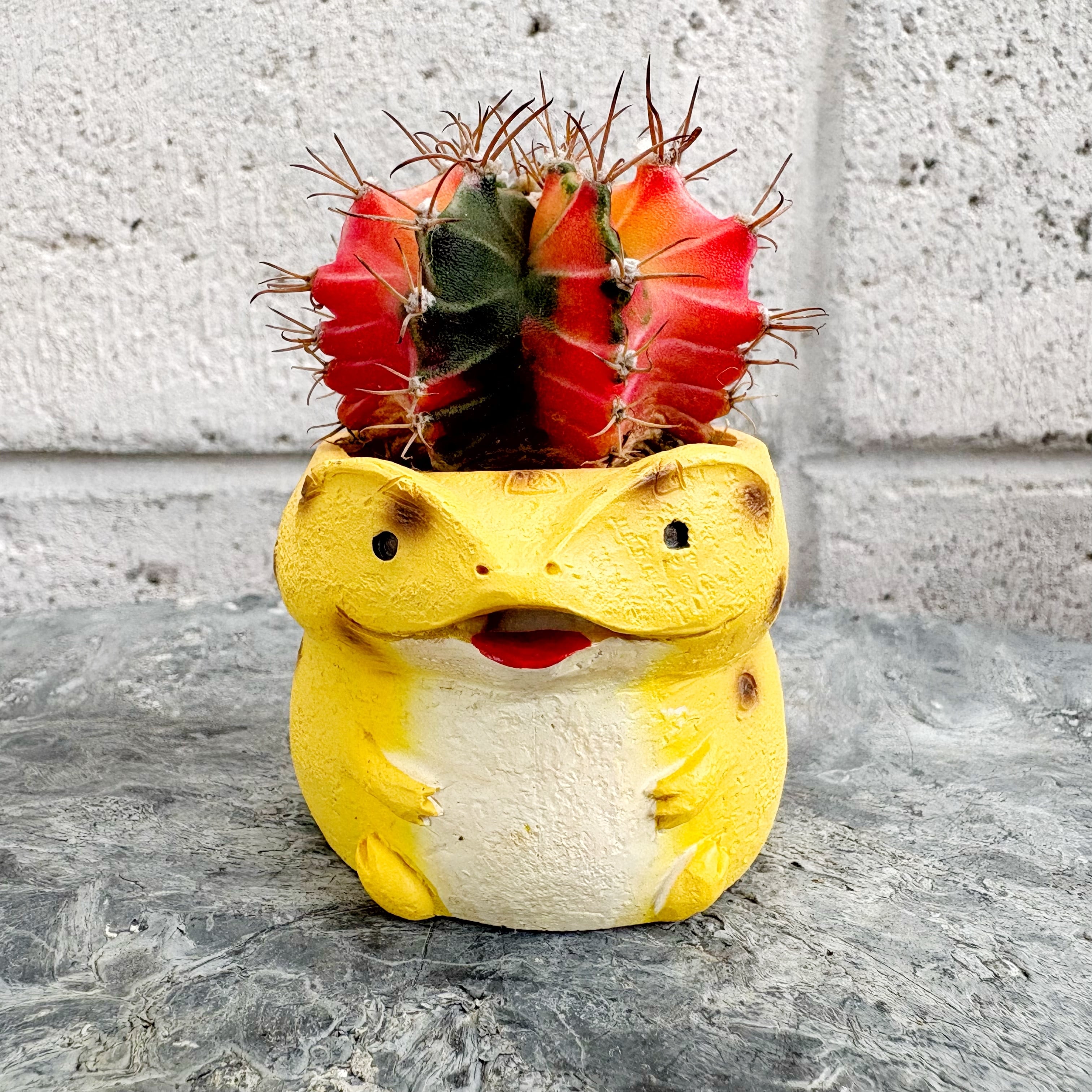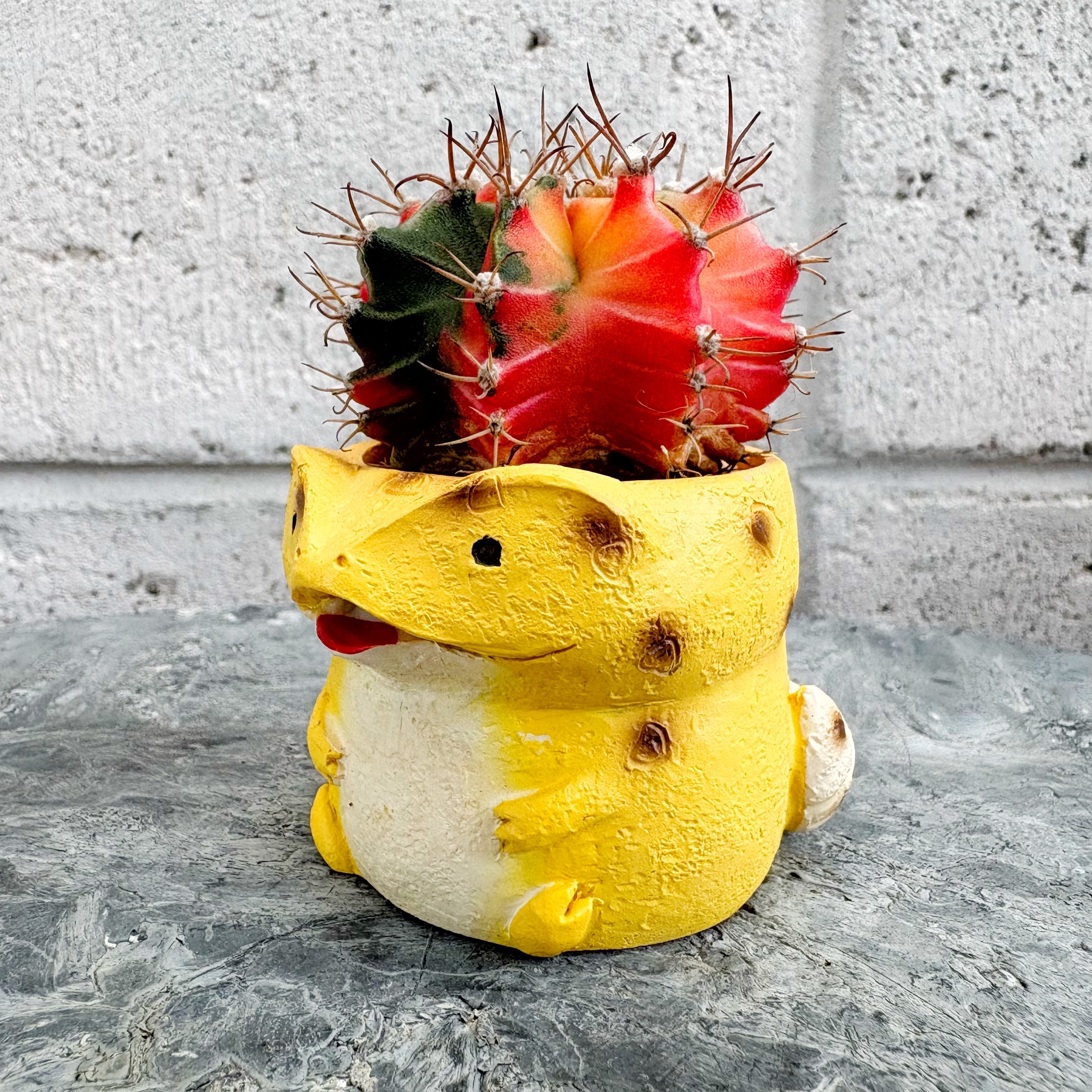 まるで小さな守り神のように佇むレオパ型のレジン鉢に、鮮やかな赤と緑のコントラストが美しいギムノカリキウムを植え込んだ、癒しと個性を兼ね備えた一点です。